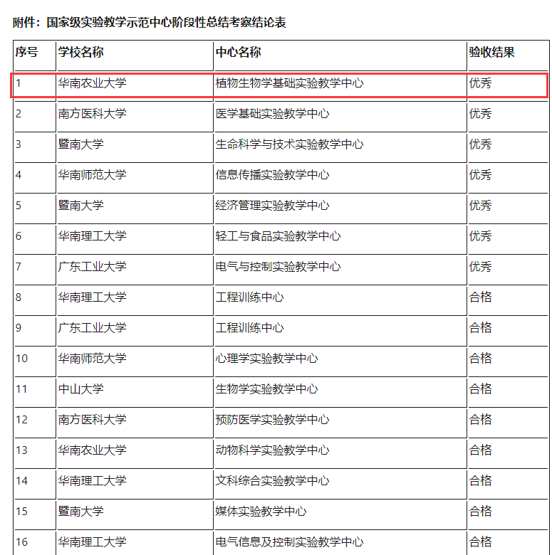 根据《教育部高等教育司关于开展国家级实验教学示范中心阶段性总结工作的通知》(教高司函﹝2023﹞3号)的通知精神,广东省教育厅于今年5月启动省内43个国家级实验教学示范中心2018—2022阶段性总结工作。学校本科生院对此高度重视,迅速组织我校相关国家级实验教学示范中心开展工作总结,汇编材料报告。近日,广东省教育厅公布广东省本科高校国家级实验教学示范中心阶段性总结考察结果,我校植物生物学基础国家级实验教学示范中心位列前茅,被评为优秀。